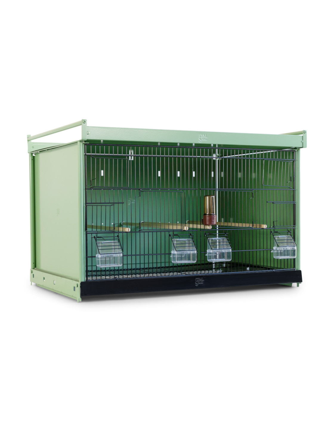 Front divisible in 2 parts of 30 cm, 4 doors for ext.feeders 2 for int. 1 bottom grill and 4 perches.