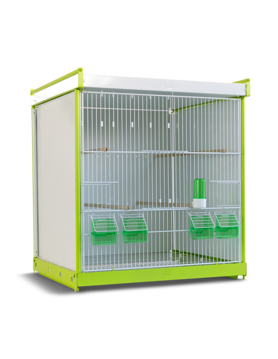 Front with 4 doors for external feeders and 2 for internal, 1 bayonet door. 1 bottom grill and 4 perches.